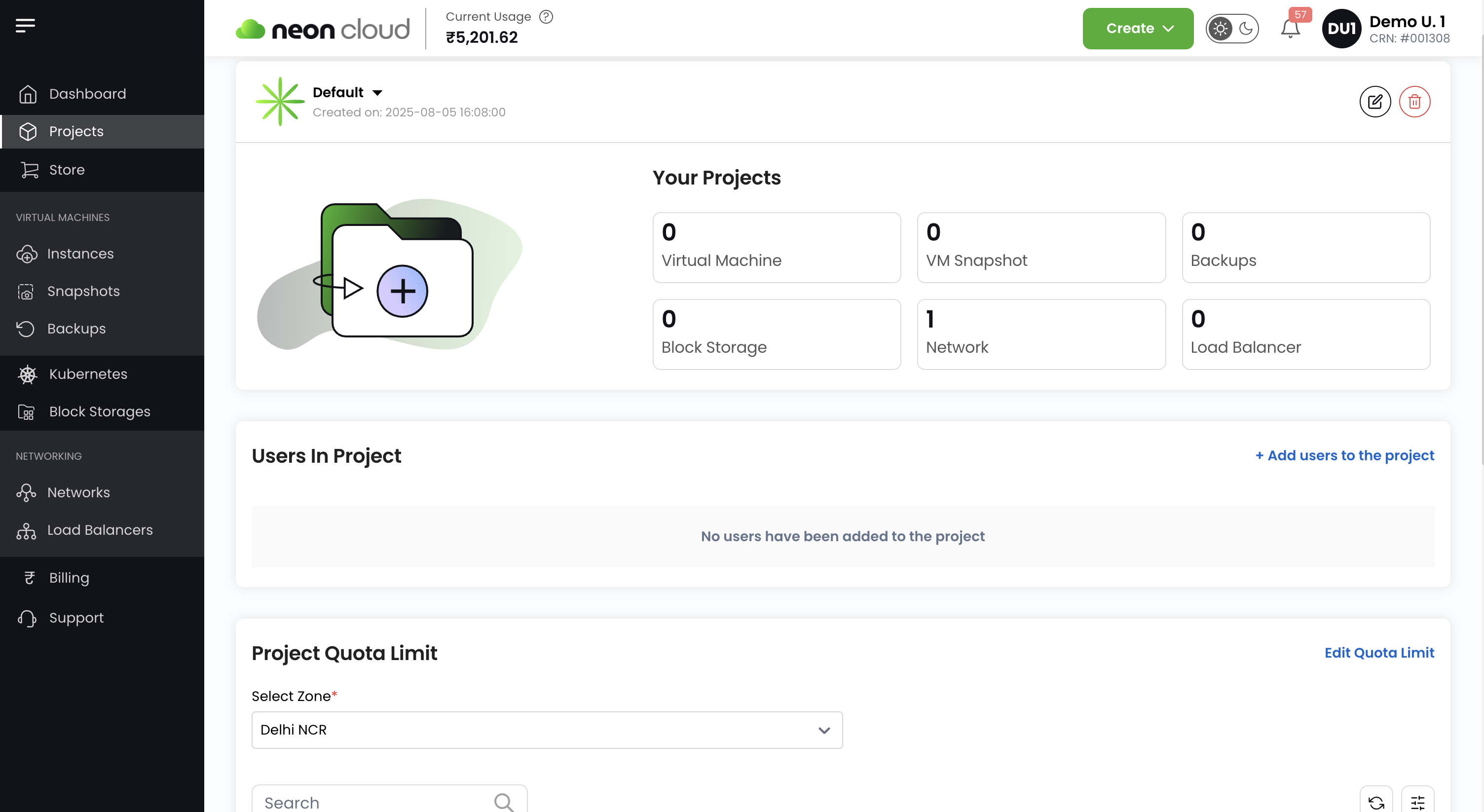 This is your default project homepage where you can see all active services within that project, view/add/remove users in the project, and see the resource quota assigned to the project.